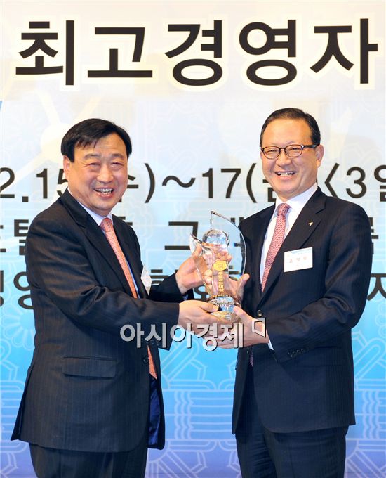 윤영두 아시아나항공 사장(우측)이 이희범 한국경영자총협회 회장(좌측)과 함께 상패를 들고 기념 촬영을 하고 있다.