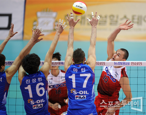 [수원=스포츠투데이 정재훈 기자] 16일 오후 수원실내체육관에서 열린 '2011-2012 NH 농협 V리그' KEPCO와 대한항공의 경기에서 안젤코가 스파이크를 때리고 있다. 스포츠투데이 정재훈 사진기자 roze@<ⓒ아시아경제 & 재밌는 뉴스, 즐거운 하루 "스포츠투데이(stoo.com)">정재훈 사진기자 roze@<ⓒ아시아 대표 석간 '아시아경제' (www.newsva.co.kr) 무단전재 배포금지>