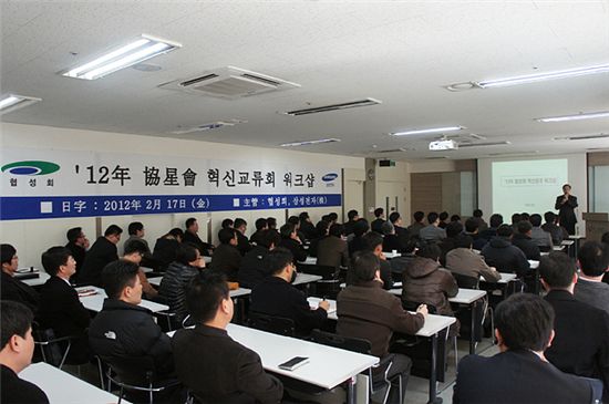 삼성전자가 17일 경기 수원 제일컨설팅 교육장에서 협력사의 경쟁력 강화를 위해 '2012년 협성회 혁신교류회 워크숍'을 개최했다. 한종수 삼성전자 협력사 경영자문단 상무가 협력사 대표들에게 2012년 협성회 혁신교류회의 활동을 설명하고 있다.<br />