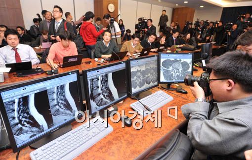 [아시아경제 오진희 기자] 박원순 서울시장의 아들 주신씨가 MRI(자기공명영상) 재검 결과 병무청 보유본과 같은 것으로 드러났다. 따라서 그동안 강용석 의원이 주신씨의 병역비리의혹을 제기하면서 “MRI를 바꿔치기했다”고 한 주장은 거짓인 것으로 입증됐다.박 시장의 아들 주신씨는 22일 오후 2시 40여분 가량 연세대 세브란스병원 종합관에서 MRI 촬영을 받았다. 이날 박주신씨의 재검에는 연세대 세브란스 병원의 부원장이자 신경외과 전문의 윤도흠 교수(대한척추신경외과협회 회장), 정형외과 이환모 교수, 영상의학과 김명준 교수, 이승구 교수가 함께 판독했다.이날 3시 40분께 주신씨의 재검 결과 브리핑에서 윤도흠 교수는 “문제되고 있는 지난해 12월 촬영한 것과 오늘 촬영한 결과 두 촬영본이 동일하다는 결론을 내렸다”고 말했다. 12월 촬영은 자생병원에서 찍은 영상이다. 윤 교수는 “두 촬영본을 비교해 볼 때 우선 4~5번 디스크의 튀어나온 정도와 방향이 동일하고, 하요추부의 피하지방의 두께가 약 3cm정도로 같다”면서 “척추와 하지를 연결하는 장요근의 모양과 척추후관절의 각도와 퇴행정도도 동일했다”고 설명했다.주신씨의 변호를 맡고 있는 엄상익 변호사는 이날 “강용석 의원에 대해 모든 책임을 원칙적으로 묻고 최종적인 의견을 박 시장이 결정하도록 맡길 것”이라면서 “현재 안상훈 변호사가 소송을 준비 중에 있다”고 말했다. 박 시장도 이날 서울시 류경기 대변인을 통해 “재촬영 결과 강용석 의원 등이 제기한 병역비리 의혹은 완전히 허구이며 정치적인 공세임이 명명백백히 드러났다”면서 “강 의원은 국회의원직에서 당연히 사퇴해야할 것이고 나아가서 정계를 영원히 떠나야한다고 본다”고 밝혔다.류 대변인은 “어떻게 강 의원이 사적인 기록을 취하게 됐는지도 밝혀야 할 것이며, 앞으로 충분히 법률적 검토를 통해 민형사상 책임을 물을 것”이라고 덧붙였다.최근 감사원 홈페이지에 글을 게재해 강 의원의 주장에 힘을 실어줘 논란이 확산되게 한 한석주 연세대 세브란스 병원 교수는 "박 시장과 그 가족이 상당한 고통을 받았을 것이라 생각하는데 이에대해서 진심어린 사과를 드린다"고 말했다. 한 교수는 "당시 박원순 시장 아들 키가 173㎝에 63㎏으로 알려져 그에 따라 판단했지만 이날 확인한 결과 박원순 시장 아들 키는 176㎝에 몸무게는 80.1㎏의 건장한 체격이었다"며 잘못을 인정했다. 오진희 기자 valere@<ⓒ세계를 보는 창 경제를 보는 눈, 아시아경제(www.asiae.co.kr) 무단전재 배포금지>