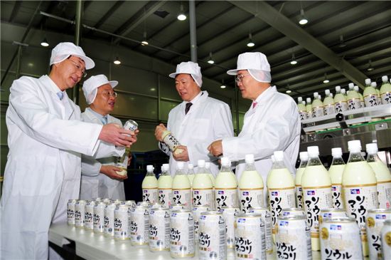 23일 충북 진천 서울장수를 방문한 신동빈 회장이 서울장수의 유재찬 사장으로부터 제품설명을 듣고 있다. <br /> <br /> (왼쪽부터 서울탁주 제조협회 김홍택 회장, 서울장수 유재찬 사장, 신동빈 회장, 롯데칠성음료 이재혁 사장.) <br /> <br /> <br /> <br /> <br />