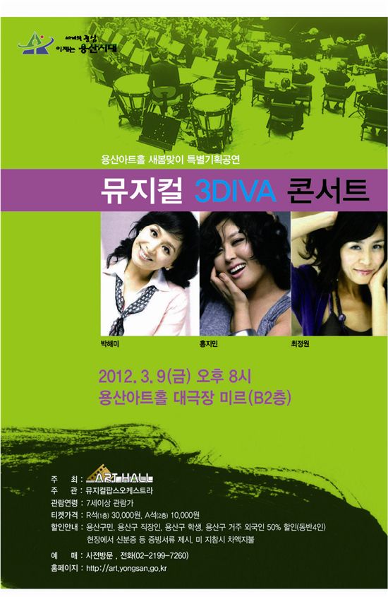 [아시아경제 박종일 기자]용산구(구청장 성장현)는 3월9일 오후 8시 용산아트홀 대극장 미르에서 대한민국 최고 뮤지컬 여배우 박해미 최정원 홍지민과 함께 하는 '뮤지컬 3DIVA 콘서트'를 연다.이번 기획 공연은 한자리에 모이기 힘든 대한민국 최고의 뮤지컬 배우 박해미, 최정원, 홍지민과 함께 하는 열정과 소통의 콘서트로 참석한 구민들 모두에게 활력과 온기를 불어넣어줄 희망의 무대가 될 것으로 기대된다.콘서트는 용산아트홀의 새봄맞이 특별 기획 공연으로 1층 R석 3만원, 2층 S석 1만원 저렴한 가격으로 선보인다.