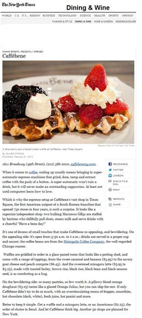 [아시아경제 오주연 기자] 미국의 유력지 뉴욕타임즈에 국내 토종 커피전문점인 카페베네가 소개됐다. 카페베네는 지난 21일(현지시간) 뉴욕타임즈 'Dining & Wine' 섹션에 카페베네의 뉴욕 맨해튼 지점 오픈을 소개하는 기사가 게재됐다고 24일 밝혔다. 뉴욕타임즈는 새벽 5시에 시작해 다음날 새벽 2시까지 영업하는 카페베네의 심야영업방식과 종이컵이 아닌 머그컵에 음료를 서빙하는 모습 등을 전달했다. 또한 전자동 에스프레소 머신을 쓰지 않고 숙련된 바리스타들이 직접 뽑아주는 카푸치노와 "Have a bene day!"라고 외치는 카페베네 스텝들의 활기찬 분위기를 소개했다.특히 다양한 토핑을 얹어주는 카페베네의 와플과 미숫가루라떼 등의 메뉴를 추천했다. 뉴욕에 50개 매장을 추가 오픈하겠다는 김선권 카페베네 대표의 계획도 전했다. 카페베네 관계자는 "뉴욕진출이 채 한 달도 안된 시점에서 미국의 대표 유력지로 꼽히는 뉴욕타임즈에 카페베네가 소개되었다는 것에 더욱 의미가 크다"며 "관심을 받고 있는 만큼 더욱 노력해 뉴욕을 시작으로 한국 커피 문화를 알리는 데 더욱 노력하겠다"고 밝혔다.오주연 기자 moon170@<ⓒ세계를 보는 창 경제를 보는 눈, 아시아경제(www.asiae.co.kr) 무단전재 배포금지>