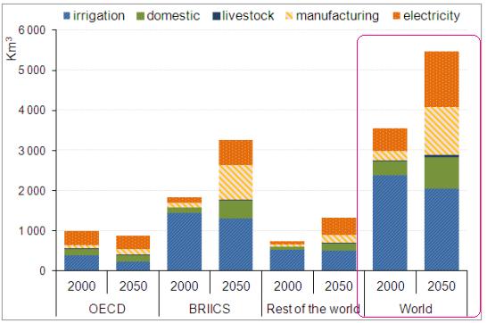 ▲(빨간색 표시 부분) 전세계 물 수요가 2000년에 비해 2050년이 되면 55% 가량 늘어날 것으로 전망됐다. 특히 막대 그래프에서 가정용(초록색), 산업용(노란색), 전력용(주황색) 물 사용이 크게 늘 것으로 예상됐다. (출처=OECD보고서)