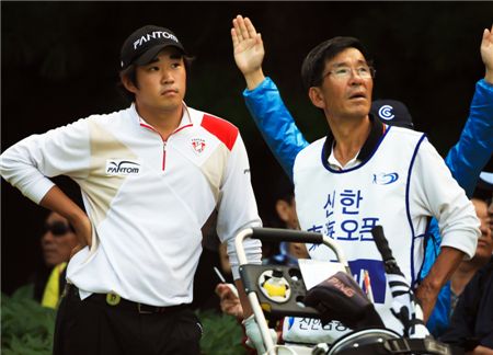 2010년 신한동해오픈에 출전한 존 허, 오른쪽이 캐디를 맡은 아버지. 사진=스튜디오PGA 제공