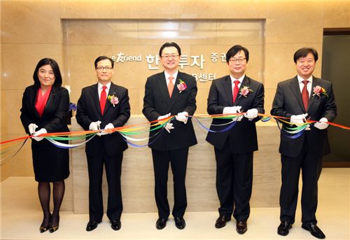 한국투자증권은 5일 한 차원 높은 고객서비스와 다양한 영업활동을 위해 압구정PB센터를 새 단장했다. 사진 왼쪽부터 임민영 마스터PB, 김정관 개인고객그룹장, 유상호 대표이사, 김민찬 압구정PB 센터장, 문진호 PB본부장.