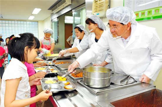 유덕열 동대문구청장이 휘경초등학교에서 아이들에게 무상급식 배식을 하고 있다.<br />