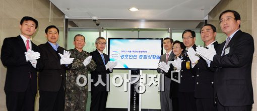 [아시아경제 윤동주 기자] 2012 핵안보정상회의 개막을 20일 앞둔 6일 서울 강남구 코엑스 도심공항타워에서 경호안전종합상황실 개소식이 열렸다. 행사에 참석한 우경갑(왼쪽부터) 종합상황실장, 방기성 소방방재본부장, 신현돈 군작전본부장, 조희용 준비기획단 부단장, 안종하 경호안전통제단 부단장, 신연희 강남구청장, 김기용 경찰작전본부장, 임창수 해경작전본부장, 홍성원 코엑스 사장이 현판식을 마친후 박수를 치고 있다.윤동주 기자 doso7@<ⓒ세계를 보는 창 경제를 보는 눈, 아시아경제(www.asiae.co.kr) 무단전재 배포금지>