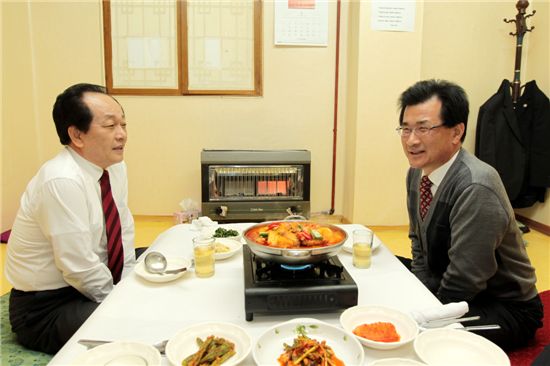 이시종(오른쪽) 충북도지사가 6일 서규용 농림수산식품부장관과 점심식사을 하며 세계유기농엑스포의 공동개최와 국제행사승인 등 사업지원을 요청했다