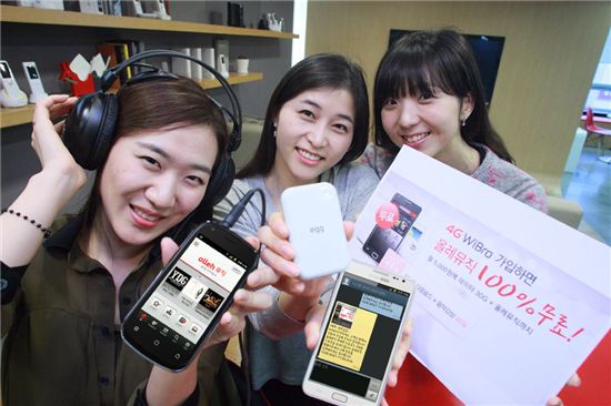 KT가 계열사 KT뮤직과 손잡고 4G 와이브로와 음악 콘텐츠를 동시에 즐길 수 있는 ‘4G 와이브로 올레 뮤직 Play’ 이벤트를 3월말까지 시행한다.