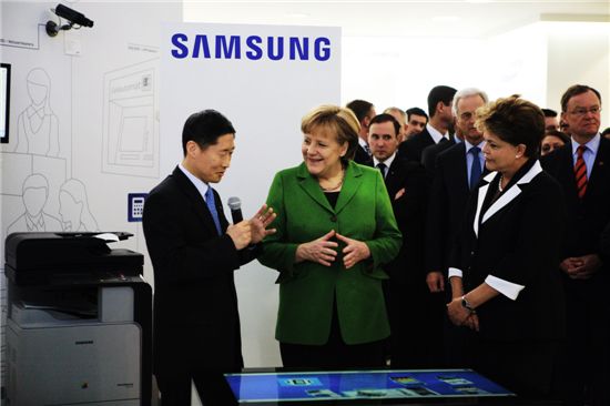 삼성전자가 6일부터 10일까지 독일 하노버에서 개최되는 세계적 정보통신기술 전시회 세빗(CeBIT)에서 2012년 프린터 신제품을 대거 선보였다. 전시회 개막일에 앙겔라 메르켈 독일 총리가 삼성전자 부스를 방문해 삼성전자 독일 법인장 이선우 전무에게 제품 설명을 듣고 있다.