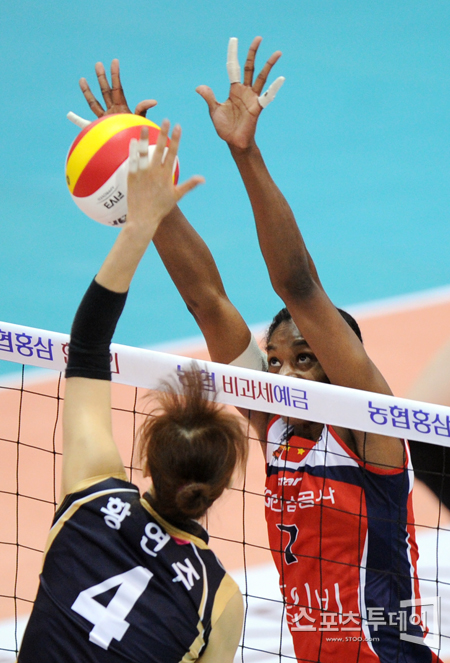 [수원=스포츠투데이 정재훈 기자] 7일 오후 수원실내체육관에서 열린 '2011-2012 NH 농협 V리그' 여자부 현대건설과 KGC 인삼공사의 경기에서 몬타뇨가 황연주의 스파이크를 막기 위해 뛰어오르고 있다.스포츠투데이 정재훈 사진기자 roze@<ⓒ아시아경제 & 재밌는 뉴스, 즐거운 하루 "스포츠투데이(stoo.com)">정재훈 사진기자 roze@<ⓒ아시아 대표 석간 '아시아경제' (www.newsva.co.kr) 무단전재 배포금지>