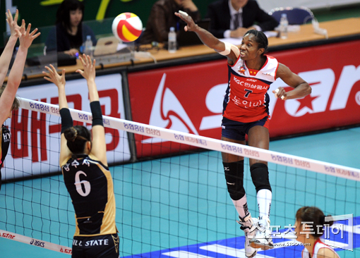 [수원=스포츠투데이 정재훈 기자] 7일 오후 수원실내체육관에서 열린 '2011-2012 NH 농협 V리그' 여자부 현대건설과 KGC 인삼공사의 경기에서 몬타뇨가 스파이크를 때리고 있다. 스포츠투데이 정재훈 사진기자 roze@<ⓒ아시아경제 & 재밌는 뉴스, 즐거운 하루 "스포츠투데이(stoo.com)">정재훈 사진기자 roze@<ⓒ아시아 대표 석간 '아시아경제' (www.newsva.co.kr) 무단전재 배포금지>