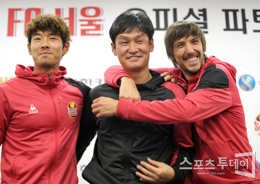 [구리=스포츠투데이 정재훈 기자] 8일 오후 구리 GS챔피언스파크에서 열린 FC서울 미디어데이에 참석한 하대성과 최용수 감독, 데얀이 포즈를 취하고 있다.스포츠투데이 정재훈 사진기자 roze@<ⓒ아시아경제 & 재밌는 뉴스, 즐거운 하루 "스포츠투데이(stoo.com)">