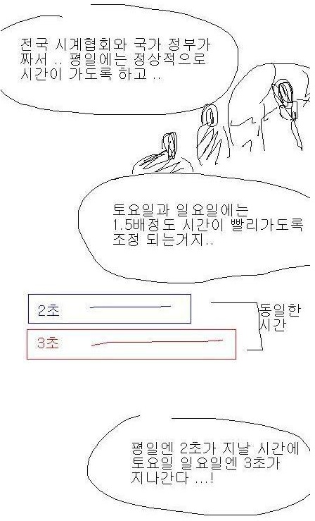 [아시아경제 박충훈 기자] 휴일에 시간이 빨리 가는 것처럼 느껴지는 이유가 누군가의 음모 때문이라는 황당한 내용의 웹툰이 네티즌에게 인기다.윈도우 OS에 내장된 '그림판' 프로그램을 이용해 웹툰을 그리는 인기 블로거 '엉덩국'이 지난 4일 자신의 블로그에 올린 '휴일 음모론(blog.naver.com/undernation/)'이라는 만화가 주인공이다.만화 속 주인공은 토요일, 일요일이 마치 하루처럼 흘러가는 것이 불만이다. 곰곰이 이유를 생각하던 주인공은 "주말에 시간이 빨리 가는 것은 단지 느낌이 아니라 실제로 빨리 가는 것"이란 결론에 도달한다.'전국 시계협회'와 정부가 협력해서 주말은 1.5배 정도로 시간이 빨리 가도록 조정하고 학교수업 시간이나 업무시간 등은 천천히 가도록 시간을 늘린다는 것이다.주인공은 수업 종료 10분전이나 퇴근 5분전이 길게 느껴진 이유도 모두 이같은 음모에서 비롯된 것이라고 정의 내린다.결국 주인공은 자신에게 온전히 주어진 하루를 보내기 위해 월요일 아침 수면을 '감행'한다. 하지만 돌아오는 건 "헛소리 하지말고 학교나 가라"는 어머니의 질책뿐이다.황당하기 그지 없는 내용이지만 네티즌은 충분히 공감 간다는 반응이다. 해당 게시물에는 "학교 졸업하고 취직해도 일주일이 똑같은 반복이다" "읽을 수록 공감이 가고 설득력 있다" "주말에 눈만 껌뻑거려도 30분이 지나가고 낮잠을 자면 밤이 되어 있었던게 전부 우연이 아니었다" 등의 댓글이 달렸다.박충훈 기자 parkjovi@<ⓒ세계를 보는 창 경제를 보는 눈, 아시아경제(www.asiae.co.kr) 무단전재 배포금지>