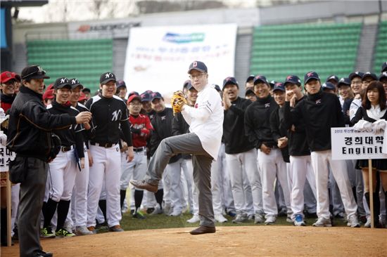 ▲박지원 두산중공업 사장(가운데)이 10일 서울 잠실야구장에서 열린 '제1회 두산중공업 초청 대학 동아리 야구대회' 개막전에서 시구를 하고 있다.