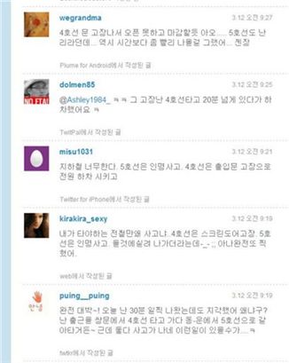 [아시아경제 조인경 기자] 12일 오전 8시15분께 지하철 4호선 한성대입구역에 정차한 오이도행 전동차 출입문이 닫히지 않는 일이 발생했다.출입문이 정상적으로 작동하지 않자 해당 지하철 운전사가 8시26분께 승객들을 전원 하차시켰고, 승객들은 5분 후인 8시31분께 한성대입구역 도착한 다음 열차에 탑승했다.트위터에는 "4호선 열차 멈춤(@cho**)", "4호선 출입문 고장으로 열차가 매우 지연됨!(@cha**)"과 같이 사고 소식을 전하는 멘션부터 "월요일 아침부터 지각하게 생겼다(@mat**)", "4호선은 죽음의 지하철인데 이 많은 승객이 언제 타고 언제 내려갈지, 이건 출근길 재난(sky**)", "30분 일직 나왔는데도 지각. 상문에서 4호선 타고 가나 동대문운동장에서 5호선 갈아타는데 둘 다 사고가 나네(@pui**)" 등 이용객들의 불만이 쏟아졌다.서울메트로 측은 "승객이 많고 추운 날씨에 이같은 출입문 고장 사고가 일어날 수 있다"며 "정확한 사고 원인을 조사중"이라고 말했다.조인경 기자 ikjo@<ⓒ세계를 보는 창 경제를 보는 눈, 아시아경제(www.asiae.co.kr) 무단전재 배포금지>