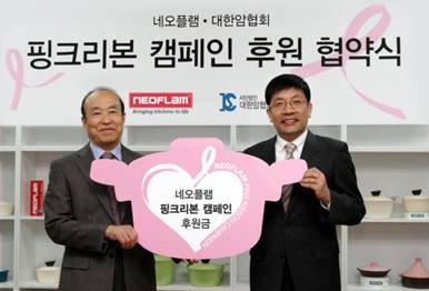 [아시아경제 이승종 기자] 주방업체 네오플램(대표 박창수)은 지난 13일 서울 화곡동 네오플램 본사에서 박창수 대표, 이기철 대한암협회 사무총장 등이 참석한 가운데 ‘핑크리본 캠페인’ 협약식을 맺고 공식 후원키로 했다고 14일 밝혔다. 핑크리본 캠페인은 지난 1992년 시작된 유방암 예방 공익 캠페인이다. 네오플램은 대한암협회와 함께 '네오플램 맘(mom)나눔 핑크리본 캠페인'을 진행, 핑크 냄비와 프라이팬 기획세트 등을 선보이며 판매 수익금 일부를 후원한다.박 대표는 "네오플램이 전세계 주부들의 사랑을 받아 글로벌 주방용품 브랜드로 성장한 만큼 건강한 가정을 위한 후원활동은 물론 여성이 행복할 수 있는 사회를 만드는데 도움을 줄 수 있도록 최선을 다하겠다”고 말했다. 이승종 기자 hanarum@<ⓒ세계를 보는 창 경제를 보는 눈, 아시아경제(www.asiae.co.kr) 무단전재 배포금지>이승종 기자 hanarum@<ⓒ아시아 대표 석간 '아시아경제' (www.newsva.co.kr) 무단전재 배포금지>