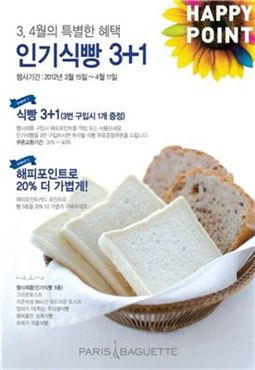 파리크라상의 대표브랜드 파리바게뜨는 15일 해피포인트 고객을 대상으로 다음달 11일까지 4주간 식빵 이벤트를 진행한다고 밝혔다. 이번 이벤트는 행사기간 동안 인기 식빵을 3번 구입하면 ‘엄마가 미(米)는 우리쌀식빵’을 무료로 제공하는 행사. 이벤트 대상 식빵은 바쁜 아침에 건강까지 챙길 수 있는 건강 식빵 5종으로 구성했다. 함평 친환경 쌀을 넣어 더욱 쫄깃한 ‘엄마가 미(米)는 우리쌀식빵’을 비롯해 바쁜 아침 그대로 토스트해서 먹을 수 있는 ‘그대로 토스트’, 56시간 숙성시켜 더욱 부드러운 ‘저온숙성 56시간 부드러운 토스트’, 몸에 좋은 블랙푸드 검은 강낭콩, 검은깨, 검은쌀이 들어간 ‘삼흑식빵’, 아이들 두뇌 회전에 좋은 오메가3, 오메가6가 들어간 ‘오메가 곡물식빵’ 등이다.식빵 구매횟수는 해피포인트 카드로 적립 또는 사용시 자동 카운팅 되며, 남은 구매횟수와 무료증정 여부는 영수증을 통해 확인할 수 있다.해피포인트 카드 소지 고객이라면 누구나 혜택을 받을 수 있으며 해피포인트 고객이 아니더라도 매장에서 즉시 카드 발급이 가능하다. 오주연 기자 moon170@<ⓒ세계를 보는 창 경제를 보는 눈, 아시아경제(www.asiae.co.kr) 무단전재 배포금지>