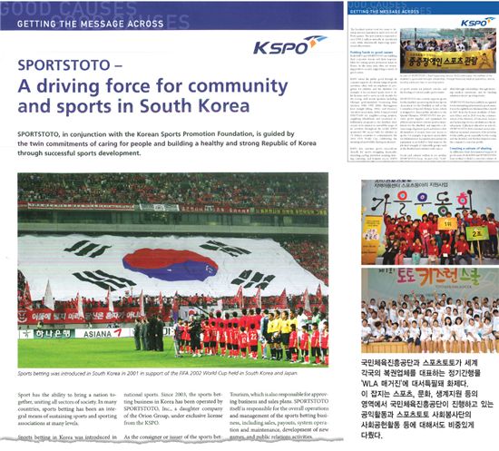 국민체육진흥공단과 스포츠토토가 세계 각국의 복권업체를 대표하는 정기간행물 ‘WLA 매거진’에 대서특필돼 화제다. 국민체육진흥공단이 발행하는 국내 유일의 체육진흥투표권 사업자인 스포츠토토는 WLA매거진 2011/2012 겨울판에 ‘스포츠토토는 한국스포츠와 지역사회 발전의 원동력’ 이라는 제목으로 전 세계에 소개됐다. '장 요르겐센' 세계복권협회(WLA) 사무총장은 국민체육진흥공단과 스포츠토토에 대해 ‘대한민국 스포츠발전의 근간을 이루고 있다’며 극찬했다.세계 각국의 복권업체를 대표하는 정기간행물 ‘WLA (World Lottery Association)매거진 2011/2012 겨울판에 스포츠토토가 ‘한국스포츠와 지역사회 발전의 원동력’ 이라는 제목으로 전 세계에 소개됐다. 18페이지부터 21페이지까지 무려 4장에 걸쳐 소개된 이번 기사는 아시아 최초로 개최된 2002 FIFA 한일월드컵의 성공적인 개최를 위해 기여한 국민체육진흥공단과 스포츠토토의 업적을 비롯해, 국민체육진흥기금 조성을 통해 전국민이 누구나 체육복지 혜택을 누릴 수 있도록 일조하고 있는 활동 등을 상세히 전했다. 세계복권협회는 1999년 8월 AILE(국제복권협의회)와 INTERTOTO (국제 토토, 로또 협의회)의 통합으로 출범돼 전 세계에서 활동 중인 복권업체를 대표하는 기관으로, 전세계 82개국 145개 회원사를 보유하고 있는 복권업계 최대 권위의 협회다. 미국 켄터키주 복권운영기관의 아서 글리슨 회장이 WLA 집행위원회를 맡고 있으며 주 활동은 연 1회 세계복권총회 개최, 주요 업무별 위원회 활동을 통한 복권산업의 각종 표준약정 수립, 각 회원 기관간의 상호 교류 유도 등의 활동을 하고 있다. 이곳에서 발행하는 WLA 매거진은 연 2회 발행되며, 세계 복권사업의 동향과 주요 이슈 등을 공유하고 있다. 매거진의 발행인 쟝 요르겐센 사무총장은 발간사를 통해 “스포츠토토로 조성되는 대다수의 기금은 한국의 풀뿌리 스포츠와 프로 스포츠, 국가대표 등에 쓰이며 대한민국 스포츠 발전의 근간을 이루고 있다” 고 강조하며 국민체육진흥공단과 스포츠토토의 역할에 대해 칭찬의 말을 아끼지 않았다. 요르겐센 사무총장은 20년 이상 세계 복권 산업에서 경력을 쌓아온 인물로 주로 북유럽 국가의 독점 복권업체를 위해 일해왔으며, 덴마크 국영복권사 단스크 스필(Danske Spil)의 최고경영자를 역임했으며, 2009년부터 세계복권협회 사무총장을 맡고 있다. 특히 이번 기사에서는 체육진흥투표권 발매를 통해 조성된 체육진흥기금이 국민체육진흥기금(78%)과 발매대상 경기주최단체 지원(10%), 문화체육관광부 지정 사업(7%), 지방 자치단체 공공체육시설 개보수 지원(5%) 등에 쓰인다는 사실과 한국 스포츠 베팅의 역사 등 비교적 자세한 정보를 게재해 눈길을 끌었다. 이 밖에, 기업의 사회적 책임을 다하기 위해 스포츠, 문화, 생계지원 등의 영역에서 국민체육진흥공단이 진행하고 있는 공익활동과 스포츠토토 사회봉사단의 사회공헌활동 등에 대해서도 비중 있게 다뤘다. 실제로 국민체육진흥공단이 발행하는 체육진흥투표권 수탁사업자 스포츠토토의 공식 온라인 발매사이트인 베트맨(www.betman.co.kr)은 지난 2009년 10월부터 사랑의열매(사회복지공동모금회)와 손잡고 매달 정기적으로 진행하고 있는 사회공헌 프로그램인 '희망더하기 사랑나누기' 캠페인을 진행하고 있으며 이를 통해 적립된 기부금으로 자전거와 스포츠용품을 구입해 '푸른초장공동생활가정' 어린이들에게 전달하는 등 이웃사랑의 따뜻한 마음을 나누고 있다. 그 밖에도 WLA매거진에서는 2008년부터 급격히 증가하고 있는 불법 온라인 스포츠베팅 시장 근절을 위한 공단과 스포츠토토의 적극적인 대처방안을 소개함과 동시에 지난 2010년 WLA로부터 사업운영의 건전성 정도를 알 수 있는 국제적 지표 ‘WLA 게임산업 건전화 국제규격 3단계 인증’을 취득한 성과를 전하며 공단과 스포츠토토의 건전화 노력을 높게 평가했다. WLA 매거진에서는 “한국은 아시아에서 축구, 야구, 농구 등 가장 다양한 프로스포츠를 운영하고 올림픽, 월드컵 등 다양한 국제대회에서 좋은 성적을 거두고 있는 스포츠 강국” 이라며 “국민체육진흥공단과 스포츠토토는 국내 엘리트 스포츠 및 국민생활체육 진흥이라는 본연의 목적뿐만 아니라 다양한 국제 스포츠 이벤트의 성공적 개최 지원을 통해 지속적으로 발전해 나갈 것” 이라고 한국 스포츠베팅의 밝은 미래를 전망했다.평등한 ‘스포츠 복지’ 환경조성 앞장2001년 10월부터 발매를 시작한 스포츠토토는 2002년 한-일 월드컵을 앞두고 월드컵 성공적 개최를 위한 재원조달과 국민체육재원 조성을 목적으로 시작됐다. 스포츠토토는 경마나 경륜 등과 같이 축구 등 스포츠 경기의 결과를 예상해 베팅을 하고, 결과에 따라 배당을 받는 것이다. 현재 축구 야구 농구 배구 골프 등 5개 종목을 대상으로 베팅을 하고 있다. 스포츠토토는 지난 10년간 총 8조1555억원의 발매를 했고, 이를 통해 2조1859억원의 국민체육진흥기금을 조성했다. 스포츠토토 발매 등을 통해 마련된 국민체육진흥기금은 국민 모두가 평등한 스포츠 복지 혜택을 누릴 수 있는 환경을 조성하는 데 집중