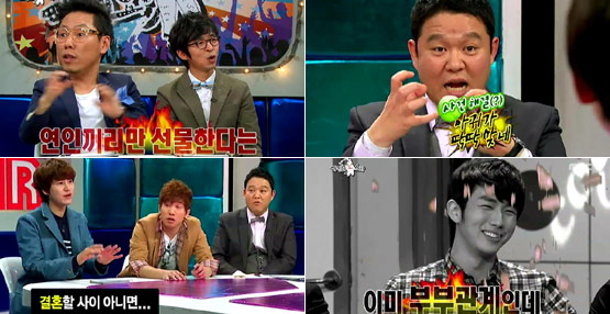 1. ‘라디오 스타’에서 슬옹은 지난해 크리스마스 새벽 1시에 원더걸스의 소희와 만나 레스토랑에서 베트남 쌀국수를 먹는 장면이 포착되며 불거진 열애설에 대해 “친한 오빠동생 사이”라고 해명했다. 그러나 ‘라디오 스타’ MC들은 슬옹이 그 날 트렁크에서 꺼내 소희에게 선물한 쇼핑백 4개에 대해 집요하게 물고 늘어졌는데, 슬옹이 쇼핑백 4개 중 3개에 들어 있었다고 밝힌 그것, MC들이 “연인끼리만 선물하는 것”이라 주장한 그것의 정체는?