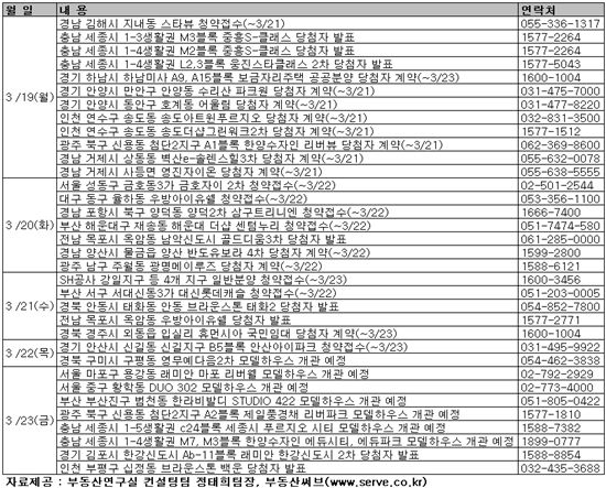 [아시아경제 박미주 기자]4월 총선 이전에 분양을 하려는 사업장이 늘어 3월 말까지는 분양물량이 늘어날 것으로 예상된다. 부동산정보업체 부동산써브에 따르면 이번 주 분양시장은 청약접수 8곳, 당첨자 발표 8곳, 당첨자 계약 11곳, 모델하우스 개관 8곳 등이 예정됐다.20일에는 GS건설이 서울 성동구 금호동3가 632번지 일대 금호18구역을 재개발해 공급하는 ‘금호자이 2차’의 청약접수를 진행한다. 지하3~지상22층 6개동, 전용면적 59~115㎡ 총 403가구 중 38가구가 일반분양 된다. 서울지하철 5호선 신금호역과 3호선 금호역을 도보로 이용할 수 있고 동호대교, 성수대교, 강변북로, 내부순환도로, 동부간선도로, 올림픽대로 등을 통해 서울·수도권으로 쉽게 이동할 수 있다. 편의시설로는 이마트, 금남시장, 현대백화점, 서울중앙병원, 순천향대병원, 한양대병원 등을 이용할 수 있다. 금호초, 금호여중, 광희중, 무학여고, 성동고 등의 교육시설도 인접해 있다.같은 날 포스코건설이 부산 해운대구 재송동 87-3번지 일원에 공급하는 '해운대 더샵 센텀누리'의 청약접수를 진행한다. 지하3~지상27층 4개동, 전용면적 72~127㎡ 총 375가구 중 241가구가 일반분양 된다. 부산지하철 2호선 센텀시티역을 이용할 수 있고 해운대로, 센텀남대로, 광안대교 등을 통해 다른 지역으로도 쉽게 이동할 수 있다. 단지 인근에 벡스코(BEXCO), 롯데백화점, 신세계백화점, 홈플러스, 부산시립미술관, 올림픽공원, APEC 나루공원 등의 편의시설을 이용할 수 있다. 센텀초, 센텀중, 해강중, 센텀고, 해강고, 부산문화여고 등의 교육시설도 인접해 있다. 21일 롯데건설이 부산 서구 서대신동3가 650번지 일대 서대신1구역을 재개발해 공급하는 ‘대신 롯데캐슬’의 청약접수를 진행한다. 지하1~지상22층 10개동 전용면적 33~129㎡ 총 753가구 중 538가구가 일반분양 된다. 부산지하철 1호선 서대신역을 도보 5분 내로 이용할 수 있고 구덕터널, 대티터널, 부산터널 등이 인근에 위치하고 있다. 단지 인근에 구덕공설운동장, 부산위생병원, 서부경찰서, 동아대학교 의료원 등의 편의시설을 이용할 수 있다. 인근 교육시설로는 구덕초, 대신초, 대신중, 중앙여중, 부산여중, 경남고, 부경고 등이 있다. 23일 삼성물산이 서울 마포구 용강동 285번지 일대 용강 2구역을 재개발해 공급하는 ‘래미안 마포 리버웰’의 모델하우스를 개관한다. 지하3~지상23층 9개동, 전용면적 59~114㎡ 총 563가구 중 115가구가 일반분양 된다. 서울지하철 5호선 마포역과 6호선 대흥역을 도보로 이용할 수 있고 강변북로, 올림픽대로, 서강대교, 마포대교 등도 쉽게 이용할 수 있다. 편의시설로는 이마트, 현대백화점, 신촌세브란스병원, 강북삼성병원 등을 이용할 수 있고 염리초, 신석초, 신수중, 서울여중, 서울여고, 광성고 등의 교육시설도 인접해 있다.같은 날 한라건설이 부산 부산진구 범천동 1000-24번지 일대에 공급하는 ‘범내골역 한라비발디 STUDIO 422’의 오피스텔 및 도시형생활주택 모델하우스를 개관한다. 지하3~지상25층 1개동, 도시형생활주택 전용면적 18.62~23.84㎡ 총 150가구, 오피스텔 전용면적 26.59~29.81㎡ 272실로 구성된다. 부산지하철1호선 범내골역을 도보 5분내로 이용할 수 있다. KTX 부산역은 차량으로 약 15분 거리다. 황령산터널도 가까워 해운대, 광안리 등 도심으로의 접근이 수월하고 동서고가로, 범일로, 중앙대로 등도 쉽게 이용할 수 있다. 편의시설은 롯데백화점 부산본점, 현대백화점 부산점, 서면, 이마트 문현점, 홈플러스 밀리오레점, 자유시장, 행복한병원, CGV, 밀리오레, 시립도서관 등을 이용할 수 있다. 같은 날 이안R&C가 서울 중구 황학동 938번지 일대에 공급하는 ‘DUO 302'의 오피스텔 및 도시형생활주택의 모델하우스를 개관한다. 지하5~지상19층, 도시형생활주택 전용면적 15㎡ 총 98가구, 오피스텔 전용면적 23㎡ 204실로 구성된다. 서울지하철 2·6호선 신당역을 도보로 이용할 수 있고 왕십리뉴타운이 도로 건너편에 위치해 있다. 편의시설로는 이마트, 청계천, 무학봉근린공원 등이 이용 가능하다. 신당초, 성동고 등의 교육시설도 인접해 있다. 박미주 기자 beyond@<ⓒ세계를 보는 창 경제를 보는 눈, 아시아경제(www.asiae.co.kr) 무단전재 배포금지>
