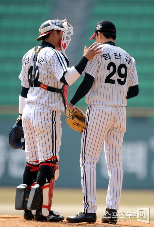 [스포츠투데이 정재훈 기자] 17일 오후 잠실야구장에서 열린 LG 트윈스와 삼성 라이온즈의 시범경기에서 김태군과 임찬규가 대화를 나누고 있다.스포츠투데이 정재훈 사진기자 roze@<ⓒ아시아경제 & 재밌는 뉴스, 즐거운 하루 "스포츠투데이(stoo.com)">