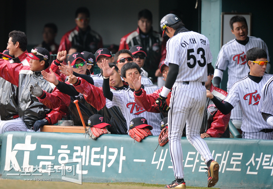 [스포츠투데이 정재훈 기자] 17일 오후 잠실야구장에서 열린 LG 트윈스와 삼성 라이온즈의 시범경기에서 득점을 올린 이대형이 동료들의 축하를 받고 있다.스포츠투데이 정재훈 사진기자 roze@<ⓒ아시아경제 & 재밌는 뉴스, 즐거운 하루 "스포츠투데이(stoo.com)">