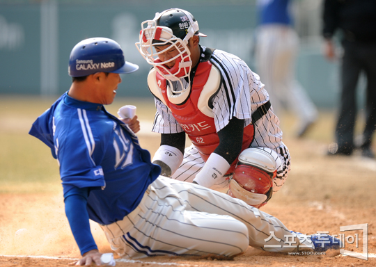 [스포츠투데이 정재훈 기자] 삼성 라이온즈가 17일 잠실 야구장에서 벌어진 2012 프로야구 시범경기에서 이승엽과 이정식의 홈런포 2방을 앞세워 LG 트윈스에게 8:3 승리를 거뒀다. 7회초 김태군이 강봉규에게 홈인을 허용하고 있다.스포츠투데이 정재훈 사진기자 roze@<ⓒ아시아경제 & 재밌는 뉴스, 즐거운 하루 "스포츠투데이(stoo.com)">