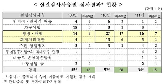 [아시아경제 지선호 기자] 코스닥시장에서 상장폐지 실질심사가 도입 되면서 불건전행위로 심사를 받는 기업이 줄어드는 등 건전성 지표가 개선되고 있는 것으로 나타났다. 20일 한국거래소는 코스닥시장에서 상장폐지 실질심사를 도입 후 3년간 59개 부실한계기업이 퇴출 됐으며, 지난해에는 34개사에 대한 실질심사를 거쳐 15개사가 퇴출됐다고 밝혔다. 지난해 퇴출기업 15개사는 전년도 퇴출건수 28개사에 비해 크게 감소한 수치다. 횡령·배임, 분식회계 등으로 인한 실질심사는 2010년 27건, 13건에서 지난해에는 16건, 3건으로 감소했다.거래소는 "불건전행위로 인한 실질심사 건수가 점차 감소하는 등 코스닥시장의 건전성이 다소 개선되고 있는 것으로 나타났다"고 밝혔다. 거래소는 타법인출자 공시와 최대주주 변경공시가 감소하는 등 여러 지표에서 시장건전성 개선효과가 나타나고 있다고 설명했다. 타법인출자는 실질심사 대상기업의 재무부실을 불러일으킬 수 있는 주요원인 중 하나이며, 최대주주 변경은 경영불안의 주요 원인이다. 또 일반공모 등 통상적인 방법으로 자금조달이 어려운 한계기업들이 시장퇴출을 회피하는 수단으로 활용하는 제3자 배정 방식 유상증자 결의 건수도 지속적으로 감소했다. 거래소는 "2009년 이후 감사의견 비적정사유의 상장폐지 기업이 급증하는 등 회계감사도 강화됐다"고 분석했다. 지난해 실질심사를 통해 퇴출된 15개사는 한계기업의 전형적인 특징을 나타냈다. 평균 상장시간이 약 10년으로 시가총액은 전체 코스닥상장기업 평균 시가총액 1023억원의 15.4% 수준인 158억원(주가 480원)이었다. 또 평균자기자본은 187억원으로 코스닥 전체평균 자기자본 613억원(10년말)의 30.5% 수준인 소규모 기업이었다. 경쟁력을 상실해 매출급감, 기존영업 중단후 신규 사업 전환실패 사례가 대부분이었으며, 최종퇴출기업은 평균 18.5%의 자본잠식상태를 기록했다. 11개사는 직전사업연도에 외부감사인이 계속기업으로 서 존속능력에 의문을 표했다. 또 최종퇴출기업은 최근 3년간 평균 3.1회 최대주주를 변경하고, 3.6회 대표이사를 변경했다. 불성실공시법인 지정, 관리종목이나 투자주의 환기종목에 지정된 상태인 경우도 다수였다.