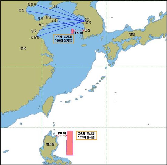 북한 로켓 발사체 낙하예상위치 및 한·중 여객항로<br />