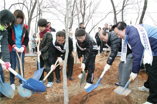 [아시아경제 박종일 기자]2014년 생태공원이 들어서 초록숲을 자랑할 성미산에 성미산지킴이와 마포구민들이 먼저 묘목을 심어본다. 마포구(구청장 박홍섭)가 제67회 식목일을 맞아 22일 오전 10시부터 성미산(성산1동 산11-64 일대)에서 지역주민과 함께 나무심기 행사를 가졌다.이 날 성미산지킴이를 비롯한 지역주민과 외국인 등 60여명과 박홍섭 마포구청장을 포함한 마포구 직원 60여명은 함께 성미산에 올라 성미산 곳곳을 가꾸었다.참가자들은 성미산 0.5㏊에 소나무 130그루, 산철쭉 1000그루, 화살나무 500그루, 청단풍 왕벚나무 때죽나무 이팝나무 각 70그루 등 7종의 묘목 총 1910그루를 심었다.또 손수 심은 묘목에는 각자의 이름표를 달고 물과 비료주기 작업도 진행했다. 아울러 구는 오는 6월까지 도시생태림조성사업의 일환으로 매봉산에도 소나무 130여주를 심을 예정이다.성경호 공원녹지과장은 “태풍피해 등으로 임상이 불량한 성미산 곳곳을 지역주민과 성미산지킴이들이 함께 참여하는 나무심기 행사를 개최함으로써 푸르고 아름다운 성미산 숲을 조성하는 뜻 깊은 행사”라며 “앞으로도 나무심기와 숲의 중요성에 대한 캠페인 등을 지속적으로 추진해 산림보호에 앞장서 나가겠다”고 말했다.박종일 기자 dream@<ⓒ세계를 보는 창 경제를 보는 눈, 아시아경제(www.asiae.co.kr) 무단전재 배포금지>