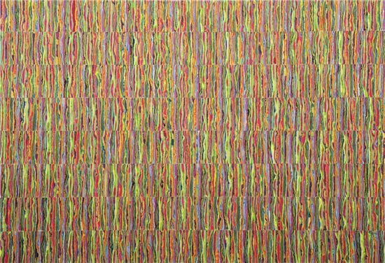작업의 긴장된 효과와 다양한 공간 표현을 구현해 낸 20여장의 겹겹이 쌓은 색 한지의 절단면은 마치 퇴적층처럼 규칙적인 수평과 수직 리듬을 지니면서 화면 위에 장엄한 물결로 펼쳐진다.서양화가 전경호(Artist, JUN KYUNG-HO)<br />