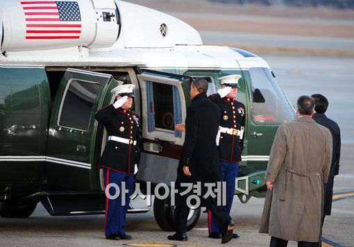 [오산=아시아경제 윤동주 기자] 25일 핵안보정상회의 참석차 한국을 방문한 오바마 미 대통령이 경기도 오산 미 공군 기지에 착륙한 전용기 에어포스원에서 내린 후 첫 일정을 소화하기 위해 헬기로 옮겨 타고 있다.윤동주 기자 doso7@<ⓒ세계를 보는 창 경제를 보는 눈, 아시아경제(www.asiae.co.kr) 무단전재 배포금지>