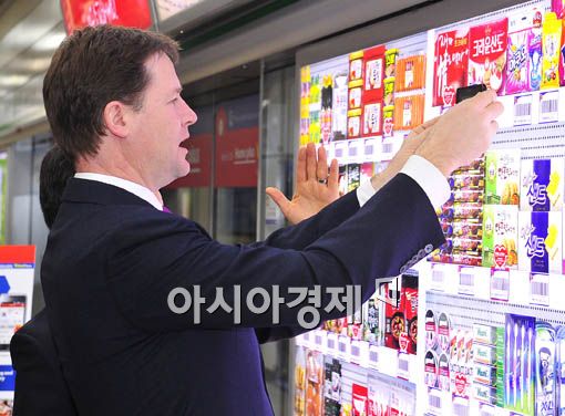 [아시아경제 양지웅 기자] 닉 클레그 영국 부총리가 26일 서울 지하철 2호선 선릉역에 설치된 '홈플러스 스마트 가상 스토어'를 방문해 스마트폰으로 물건을 직접 구매해보고 있다. 양지웅 기자 yangdoo@<ⓒ세계를 보는 창 경제를 보는 눈, 아시아경제(www.asiae.co.kr) 무단전재 배포금지>
