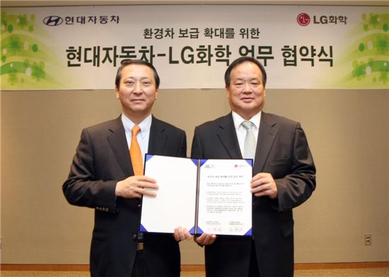 현대차 김충호 사장(오른쪽)과 LG화학 권영수 사장(왼쪽)이 26일 환경차 보급확대를 위한 업무 협약서 체결 후 기념촬영을 하고 있다.<br />