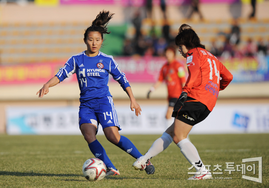 [보은=스포츠투데이 정재훈 기자] 26일 오후 보은공설운동장에서 열린 'IBK 기업은행 WK리그 2012' 고양 대교와 현대제철의 개막전에서 조소현과 최미진이 공을 다투고 있다.스포츠투데이 정재훈 사진기자 roze@<ⓒ아시아경제 & 재밌는 뉴스, 즐거운 하루 "스포츠투데이(stoo.com)">