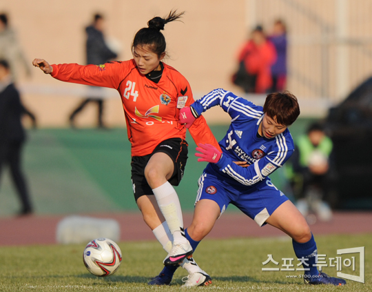 [보은=스포츠투데이 정재훈 기자] 26일 오후 보은공설운동장에서 열린 'IBK 기업은행 WK리그 2012' 고양 대교와 현대제철의 개막전에서 심서연과 정설빈이 공을 다투고 있다.스포츠투데이 정재훈 사진기자 roze@<ⓒ아시아경제 & 재밌는 뉴스, 즐거운 하루 "스포츠투데이(stoo.com)">