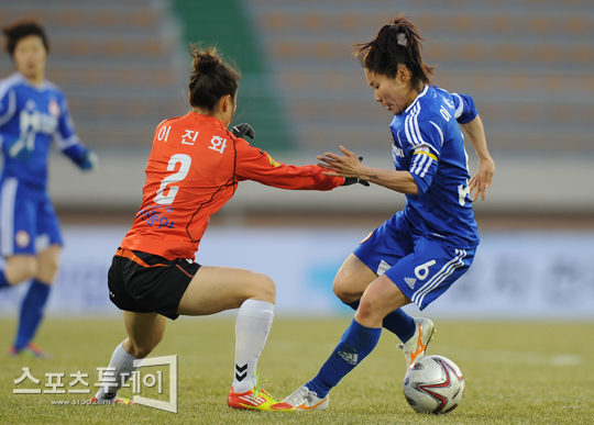 [보은=스포츠투데이 정재훈 기자] '디펜딩 챔피언' 고양 대교가 26일 오후 보은공설운동장에서 열린 'IBK 기업은행 WK리그 2012' 현대제철과의 개막전에서 이장미의 결승골로 1:0 승리를 거뒀다. 개인기로 상대선수를 제치는 이세진.스포츠투데이 정재훈 사진기자 roze@<ⓒ아시아경제 & 재밌는 뉴스, 즐거운 하루 "스포츠투데이(stoo.com)">