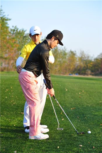 이번 레슨의 마지막 주제는 경사지에서 샷을 잘하는 법이다.연습장에서는 공이 잘 맞다가도 코스에만 나가면 엉뚱한 구질이 나오는 이유 중의 하나가 경사지 때문이다. 연습장에서는 매트 위에 공을 놓고 때리기 때문에 정확하게 임팩트가 되지 않더라도 클럽이 잘 빠져나가 그런대로 공이 날아간다.코스에서는 그러나 늘 평평하지도 않고, 라이도 좋지 않다. 경사의 정도에 따라 아예 스윙을 하기 어려운 곳도 있다. 그래서 초, 중급자들이 코스에서 처음 대면하는 어려움이 바로 '경사지 샷'이다. ▲ 공이 발 보다 높은 '훅 라이'= <사진1>이다. 배우 박재정씨는 공이 발보다 높은 라이에서 샷을 하자 평상시의 스윙 밸런스가 곧바로 무너졌다. 하체에 많은 움직임이 발생하다보니 스윙과정에서 몸이 출렁이게 되고, 당연히 임팩트도 일관성이 없다. 해결법은 오르막이든, 내리막이든 라이가 좋지 않을 때는 일단 스윙의 크기를 줄여주고 컨트롤 샷을 한다는 점이다. 무엇보다 공을 정확하게 때릴 수 있어야 다음 기회도 생긴다. 먼저 비거리가 줄어든다는 점부터 감안한다. 가능하다면 한 두 클럽 더 길게 선택할 수 있다. 하지만 경사도가 심하거나 러프나 디봇 등 라이가 좋지 않다면 다음 샷을 하기 좋은 쪽으로 목표를 변경한다. 참고로 골프는 확률의 게임이다. 무리한 샷은 반드시 더 나쁜 상황으로 이어진다는 것을 알아야 한다. 구질이 왼쪽으로 휘어지는 훅도 주의해야 한다. 오르막 라이에서는 어드레스에서 토우 부분이 들리면서 페이스 앵글이 왼쪽을 보게 된다. 셋업부터 훅이 발생하게 설정돼 있다는 이야기다. 공을 보내고자 하는 목표보다 오른쪽을 겨냥하고 자연스럽게 드로우 구질에 맞춰 샷을 진행한다.[사진2] 공이 발 보다 낮은 슬라이스 라이에서는 턱을 약간 들어 상체의 무너짐을 방지한다.