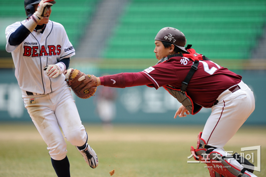 [스포츠투데이 정재훈 기자] 27일 오후 잠실야구장에서 열린 두산 베어스와 넥센 히어로즈의 시범경기 1회말 김동주 타격에 홈으로 달리던 이종욱을 태그아웃시키는 허도환.스포츠투데이 정재훈 사진기자 roze@<ⓒ아시아경제 & 재밌는 뉴스, 즐거운 하루 "스포츠투데이(stoo.com)">