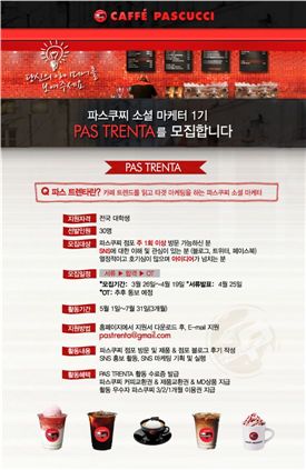 정통 이탈리안 커피 브랜드 파스쿠찌는 대학생을 대상으로 소셜마케터인 ‘파스 트렌타’ 1기를 모집한다고 27일 밝혔다.트렌타는 숫자 30을 뜻하는 이탈리아어인 동시에 트렌드(Trend)와 타깃 마케팅(Target marketing)의 합성어로 커피시장의 트렌드를 파악하고 마케팅을 실행하는 30명의 대학생 마케터 모임을 뜻한다.이번 파스 트렌타로 선발되는 인원은 3개월의 활동 기간 동안 페이스북이나 트위터 등 SNS를 활용, 파스쿠찌 브랜드와 제품을 효과적으로 알려야한다. 파스쿠찌는 이 기간 동안 월 5만원에 해당하는 커피와 신제품 교환권 등을 제공하며 우수활동자 3명을 선정해 커피와 음료 및 사이드 메뉴들을 즐길 수 있는 이용권을 별도로 증정할 계획이다.참가 희망자는 pastrenta@gmail.com로 신청서를 보내면 된다. 접수 마감은 다음달 19일까지이며 합격자 발표는 같은 달 25일에 개별 통지한다.오주연 기자 moon170@<ⓒ세계를 보는 창 경제를 보는 눈, 아시아경제(www.asiae.co.kr) 무단전재 배포금지>
