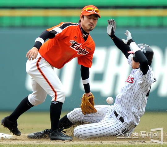[스포츠투데이 정재훈 기자] 29일 오후 잠실야구장에서 열린 LG 트윈스와 한화 이글스의 시범경기 4회말 윤정우가 2루도루에 성공하고 있다.스포츠투데이 정재훈 사진기자 roze@<ⓒ아시아경제 & 재밌는 뉴스, 즐거운 하루 "스포츠투데이(stoo.com)">