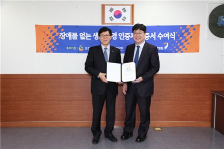‘장애물 없는 생활환경(BF)’ 인증식에 참여한 조성준 두산건설 전무(좌)와 변용찬 한국장애인개발원 원장<br />