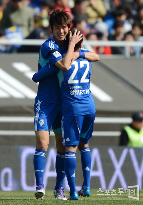 [수원=스포츠투데이 정재훈 기자] 1일 오후 수원월드컵경기장에서 열린 '현대 오일뱅크 K리그 2012' 수원 삼성과 FC서울의 경기에서 선제골을 터뜨린 박현범이 에벨톤c와 포옹을 나누고 있다. 스포츠투데이 정재훈 사진기자 roze@<ⓒ아시아경제 & 재밌는 뉴스, 즐거운 하루 "스포츠투데이(stoo.com)">