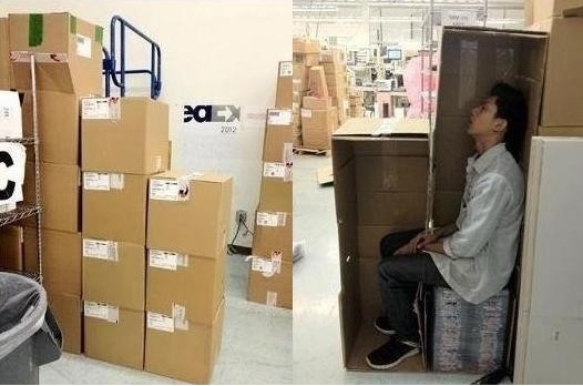 [아시아경제 박충훈 기자]혼자 편안히 쉴수 있는 공간은 모든 직장인들의 희망사항이다. 최근 네티즌에 인기를 끌고 있는 '택배회사 직원의 은신처'라는 게시물은 이러한 직장인들의 소박한 바람을 유머러스하게 표현하고 있다.이 게시물에는 상자가 수북히 쌓여있는 창고가 등장한다. 가지런히 쌓여 있는 종이 상자들은 여느 물류창고와 크게 다를 바 없다. 그러나 이 상자의 뒷면을 보면 반전이 드러난다. 상자를 쌓은 모양으로 공간을 만들어 놓고 그 안에 직원이 들어가 잠을 자고 있었던 것이다. 기발한 은신처에 웃음이 나오지만 고개를 젖힌채 곤히 잠든 직원의 모습이 애처로워보이기도 한다.박충훈 기자 parkjovi@<ⓒ세계를 보는 창 경제를 보는 눈, 아시아경제(www.asiae.co.kr) 무단전재 배포금지>