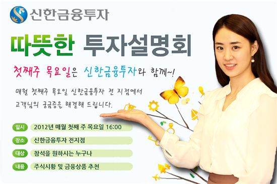 [아시아경제 송화정 기자]신한금융투자는 매달 첫 번째 목요일에 전국 84개 지점에서 동시 다발적으로 투자설명회를 개최한다. 첫 번째 설명회는 오는 5일 오후 4시에 진행되며 강의는 시황, 국내외 경제 이슈, 산업/종목 분석, 금융상품 등 해당 시점의 트렌드에 맞는 내용으로 구성된다. 강사는 각 지점의 베테랑 직원이 맡을 예정이다. 설명회에는 관심있는 투자자라면 누구나 참석 가능하다.이렇듯 신한금융투자가 직원 평가에 고객 수익률을 포함하고, 본인이 직접 강사로 나서 투자에 도움이 되는 정보를 전달해야 함에 따라 직원들은 주식시황 및 금융상품 공부에 열을 올리고 있다. 면학 분위기 조성으로 회식 문화도 달라졌다. 직원들은 '술잔은 천천히, 술자리는 짧게'라는 의미를 내포하는 'SnS(Slow & Shot)' 운동을 펼치고 있다. 술자리 대신 스터디 모임을 함께하거나 회식 종료시간을 미리 정하는 등 직원들이 업무와 공부에 집중할 수 있도록 분위기를 쇄신하고 있다.영업추진부 하성원 부장은 "고객 수익률 상위 직원 포상 제도와 더불어 매월 진행되는 고객대상 설명회는 고객 중심의 영업문화를 만드는 초석이 될 것"이라며 "앞으로도 고객 수익률 제고를 위해 힘쓰는 금융투자회사가 되겠다"고 말했다.