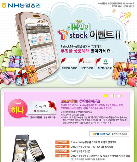 [아시아경제 김영식 기자] NH농협증권이 이달 3일부터 다음달 25일까지 ‘새봄맞이 T stock 이벤트’를 실시한다.NH농협증권 측은 “이번 행사는 ‘NH농협증권 T stock’을 통해 거래한 고객과 이벤트에 참가한 모든 고객들을 대상으로 실시하며 세 가지 혜택을 준비했다”고 밝혔다.첫째, 이벤트 기간 동안 ‘NH농협증권 T stock’을 통해 100만원 이상 주식을 거래한 고객 모두에게 신세계 백화점 상품권 1만원권 기프티콘을 증정한다. 둘째, 트위터·페이스북·미투데이 등 소셜네트워크를 통해 ‘새봄맞이 T stock이벤트’를 친구들과 함께 공유하고 이벤트 페이지(//m.nhis.co.kr)에 참여한 고객을 대상으로 매주 50명을 추첨해 ‘스타벅스 카페라떼(톨 사이즈) 기프티콘’을 준다.셋째, 센스 있는 댓글을 이벤트 페이지에 남긴 고객의 경우 매주 추첨을 통해 ‘신세계 백화점 상품권 5만원권 기프티콘’과 ‘파리바게뜨 5천원권 기프티콘’을 증정한다.