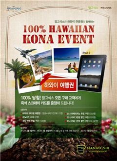 [아시아경제 오주연 기자]커피&디저트카페 망고식스가 하와이안 코나 커피 리뉴얼을 기념해 100% 당첨이 가능한 스크래치 카드 이벤트를 진행한다고 5일 밝혔다.오는 9일부터 진행되는 이번 이벤트는 망고식스 전 구매 고객을 대상으로 진행되며 즉석에서 스크래치 부분을 긁어 당첨 여부를 직접 확인할 수 있다. 행운의 1등 주인공 1명에게는 하와이안 코나 커피의 탄생지인 하와이 3박 5일 여행권을 1인 2매 증정하며 2등 2명에게는 아이패드2를 선물한다. 이 외에도 3등 100명에게는 코나 라떼 무료 쿠폰을, 4등 250명에게는 코나 아메리카노 쿠폰을 제공하며 5등 500명에게는 코나 커피 3000원 할인권을 준다. 하와이안 코나 커피는 자메이카 블루마운틴, 예맨 모카와 함께 세계 3대 커피로 손꼽히는 최고급 커피다. 망고식스는 최근 국내 로스팅 시스템을 완비해 국내 커피 프랜차이즈 최초로 밸류체인을 구축해 하와이안 코나 커피를 매장에 발 빠르게 공급, 맛과 향을 한층 업그레이드해 공급하고 있다.오주연 기자 moon170@<ⓒ세계를 보는 창 경제를 보는 눈, 아시아경제(www.asiae.co.kr) 무단전재 배포금지>