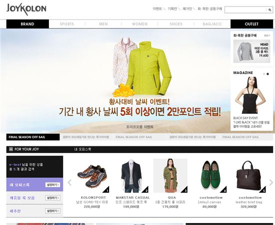 [아시아경제 박소연 기자]FnC코오롱의 통합 쇼핑몰 ‘조이코오롱(www.joykolon.com)’ 이 6일 리뉴얼 오픈했다. 코오롱스포츠, 헤드, 엘로드, 커스텀멜로우, 쿠론, 시리즈 등 고객이 관심 있는 브랜드의 상품들을 보다 편리하게 쇼핑할 수 있도록 브랜드별 상품관을 더욱 강화했다. 브랜드의 소식을 다양하게 접할 수 있는 매거진 기능도 강화했다. 고객 스스로 판매자가 되는 ‘라이크 플러스(Like Plus)’서비스도 진행한다. 고객이 특정 상품 구매 시 본인의 SNS 채널을 통해 상품을 추천할 경우 상품 추천만으로도 5%의 포인트를 적립 받게 된다. SNS채널에 홍보된 URL을 통해 타인이 제품을 구매할 경우 추천자와 구매자에게 각각 상품가격의 5%를 e-kolon카드 포인트로 돌려주다. e-kolon카드 포인트는 적립 즉시 사용이 가능하며, 오프라인매장과 온라인 조이코오롱에서 현금처럼 사용할 수 있다. 고객 맞춤형 쇼핑 기능인 ‘포 유어 조이(For Your Joy)’ 서비스도 새롭게 진행한다. 자신이 선호하는 브랜드와 가격대, 칼라, 계절, 성별 등을 지정해두면 자신의 구매 성향과 스타일에 따라 미리 설정해 둔 조건의 상품이 자동으로 추천돼 원하는 상품을 보다 빠르고 편리하게 선택할 수 있다. 최용철 코오롱 인더스트리 FnC부분 e-biz 팀장은 "리뉴얼로 추가된 고객 맞춤형 쇼핑 기능과 함께 고객에게 좀 더 편리하고 스마트한 쇼핑 경험을 제공할 것으로 기대한다"고 말했다.박소연 기자 muse@<ⓒ세계를 보는 창 경제를 보는 눈, 아시아경제(www.asiae.co.kr) 무단전재 배포금지>
